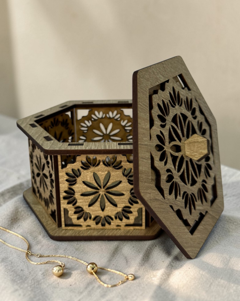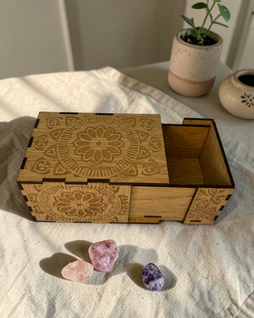 Dekorativna drvena kutija sa mandala ornamentima, idealna za čuvanje nakita i sitnica. Elegantnog dizajna i prirodnog izgleda, predstavlja i lep dekorativni detalj u prostoru.