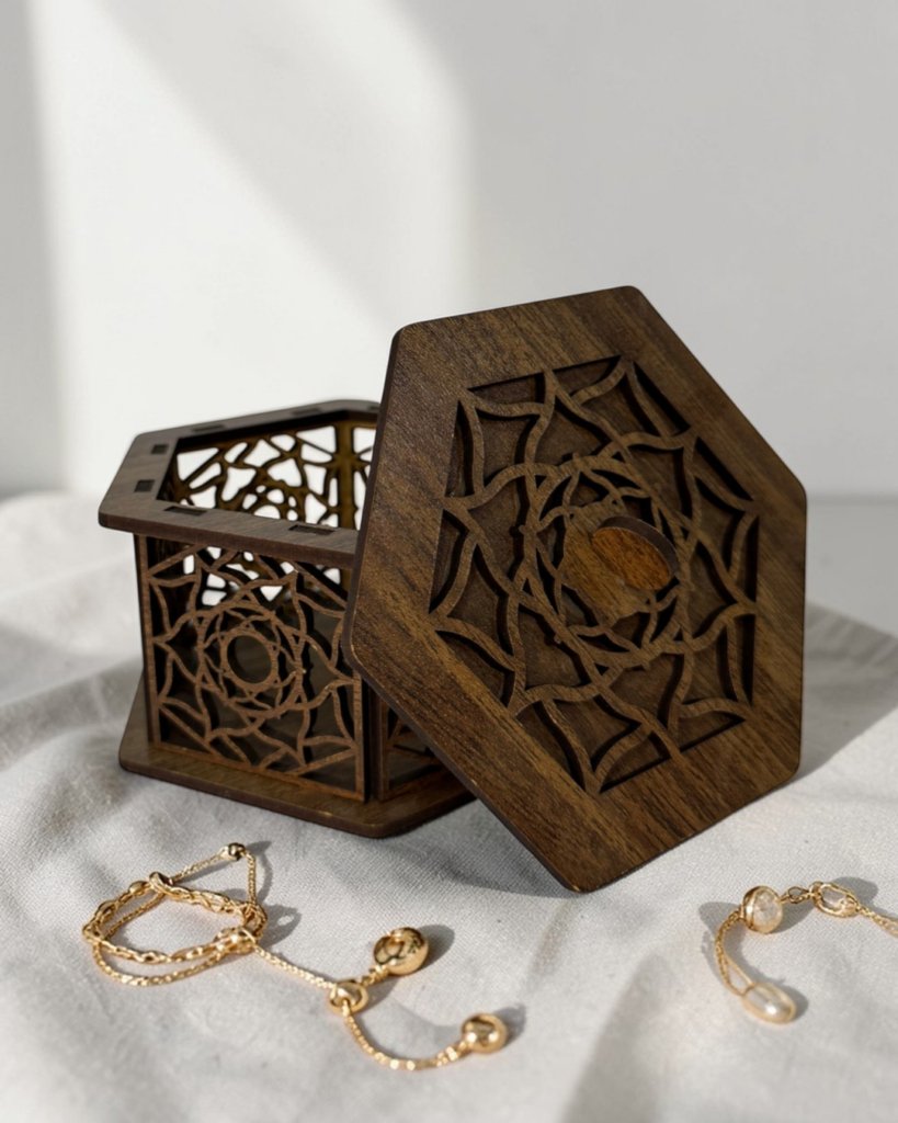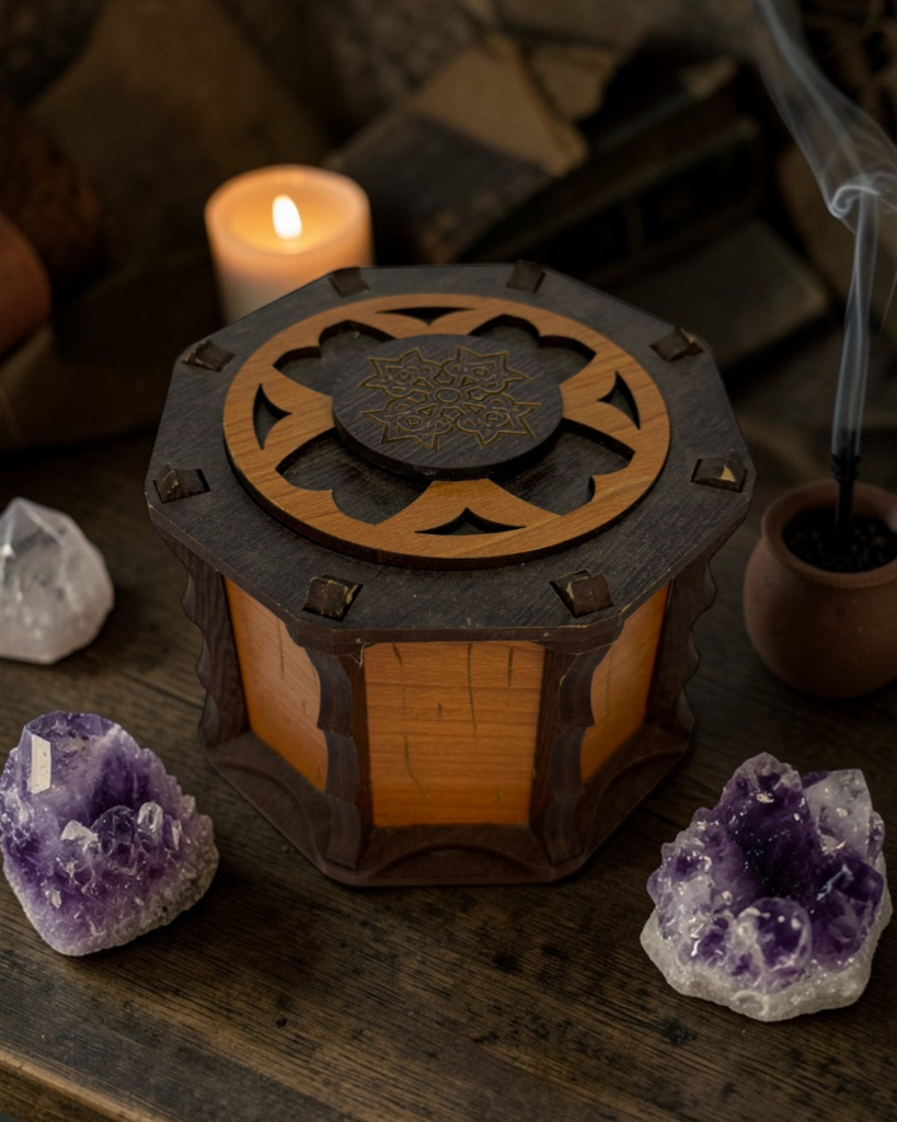 Dekorativna Trinity kutija sa gotičkim ornamentima i osmostranim oblikom, namenjena za čuvanje nakita, kristala, čaja i drugih sitnica.