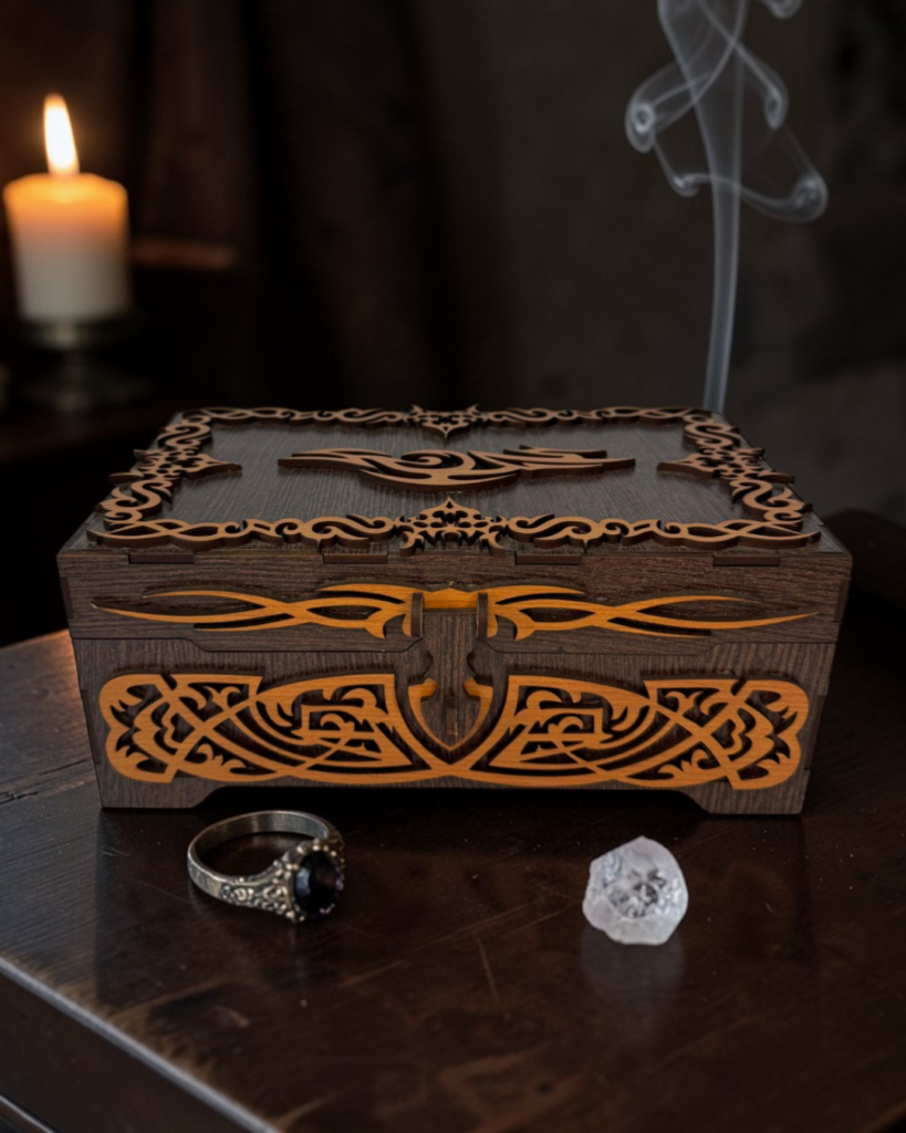 Dekorativna Trinity kutija sa gotičkim ornamentima, namenjena za čuvanje nakita, kristala, tamjana i drugih sitnica.