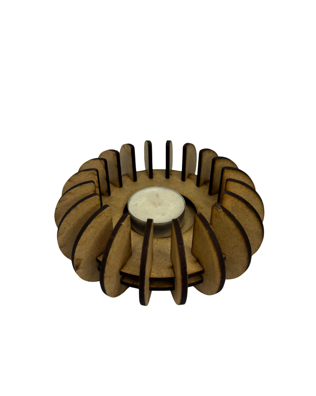 Aura Circle svećnjak izrađen je od precizno sečenog drveta koje formira elegantan kružni oblik oko sveće. Njegova struktura omogućava da se svetlost nežno širi kroz drvene elemente, stvarajući prijatnu i opuštajuću atmosferu u prostoru.