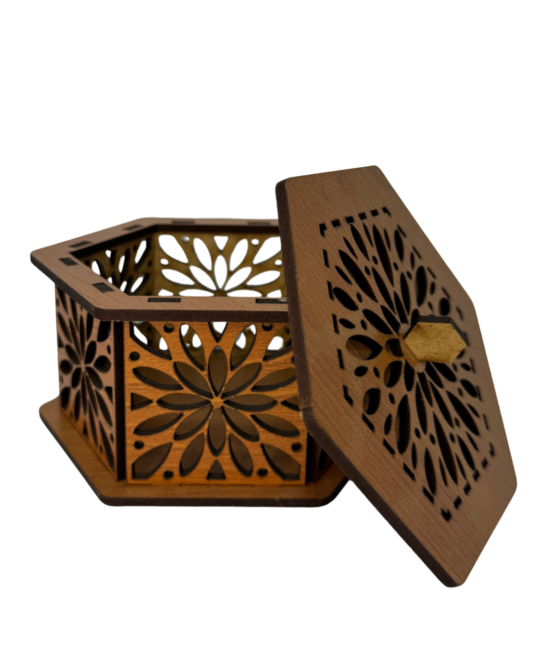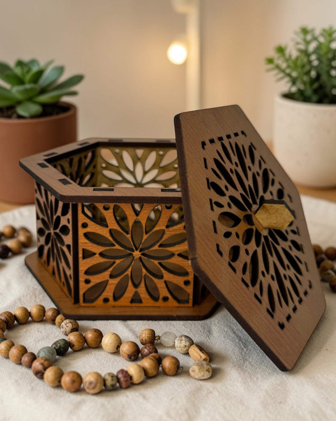 Praktičan poklopac omogućava jednostavno otvaranje i organizaciju sitnih predmeta, dok sam dizajn čini ovu kutiju elegantnim dekorativnim elementom koji se lako uklapa u različite enterijere – na stolu, polici ili toaletnom stočiću.